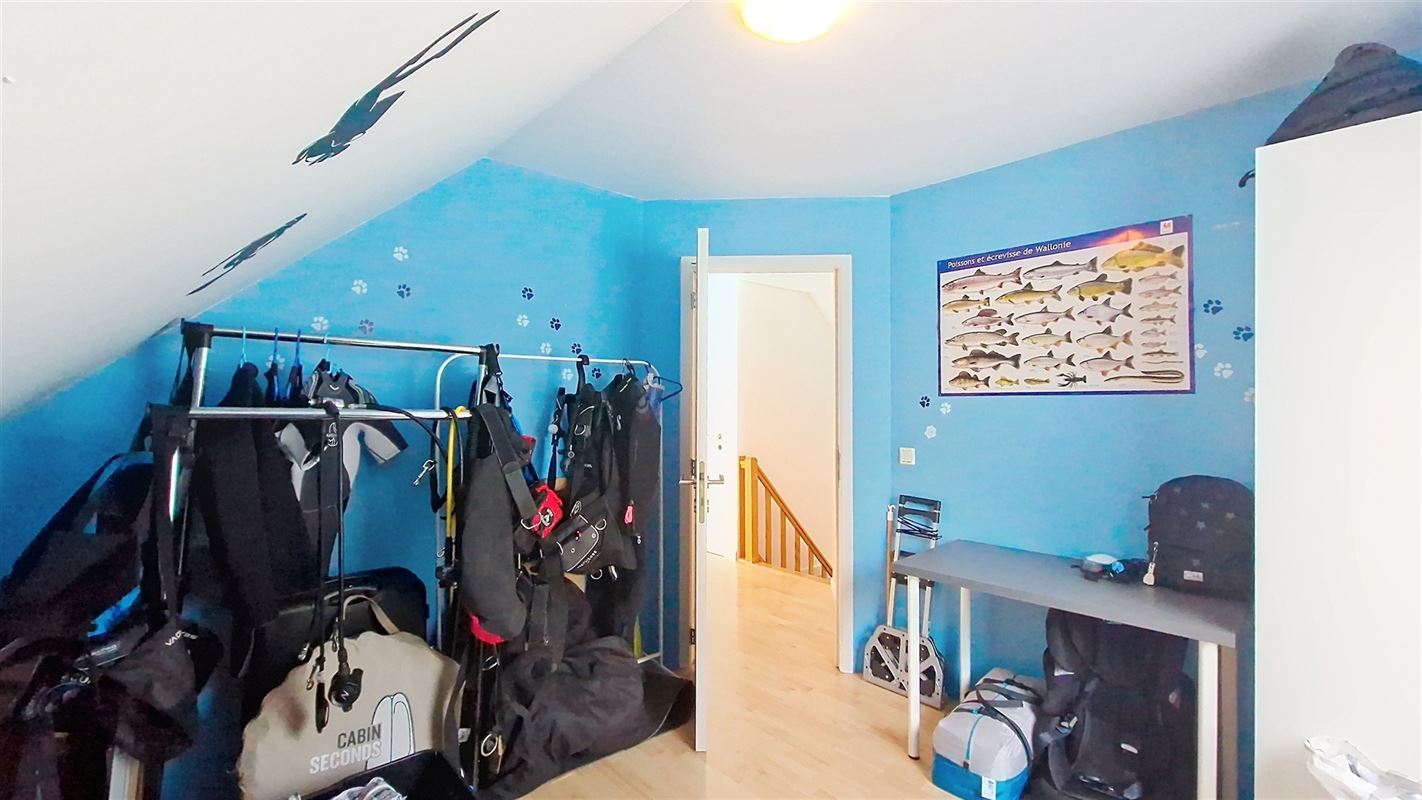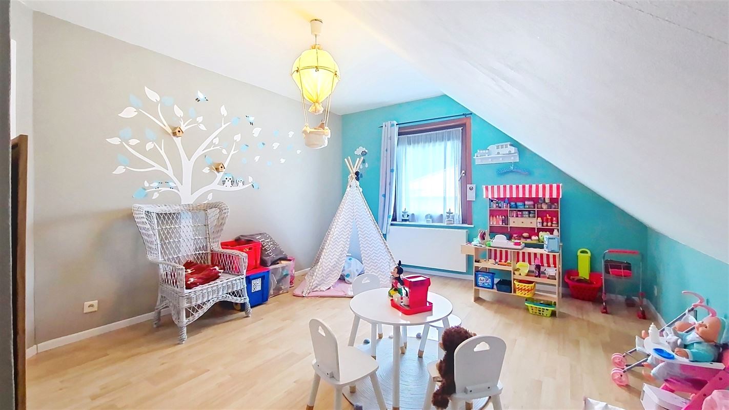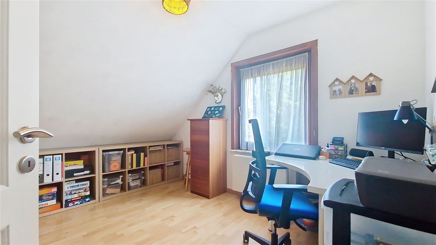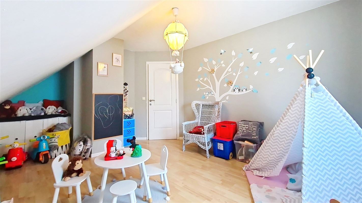 A l'étage, un hall de nuit, 4 chambres, salle de bains et wc séparé. A l'extérieur, vaste terrasse, spacieux jardin et abri de jardin.