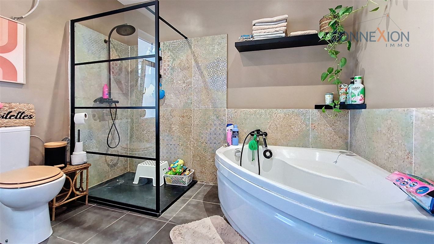 Elle se compose comme suit au rez-de-chaussée : un séjour de 34m² comprenant un salon et une salle à manger, une cuisine équipée avec îlot central, parfaite pour les repas en famille ou entre amis, une salle de bains moderne, et une buanderie pratique.