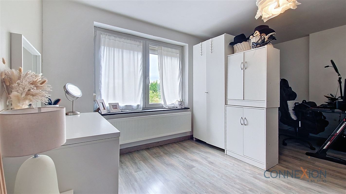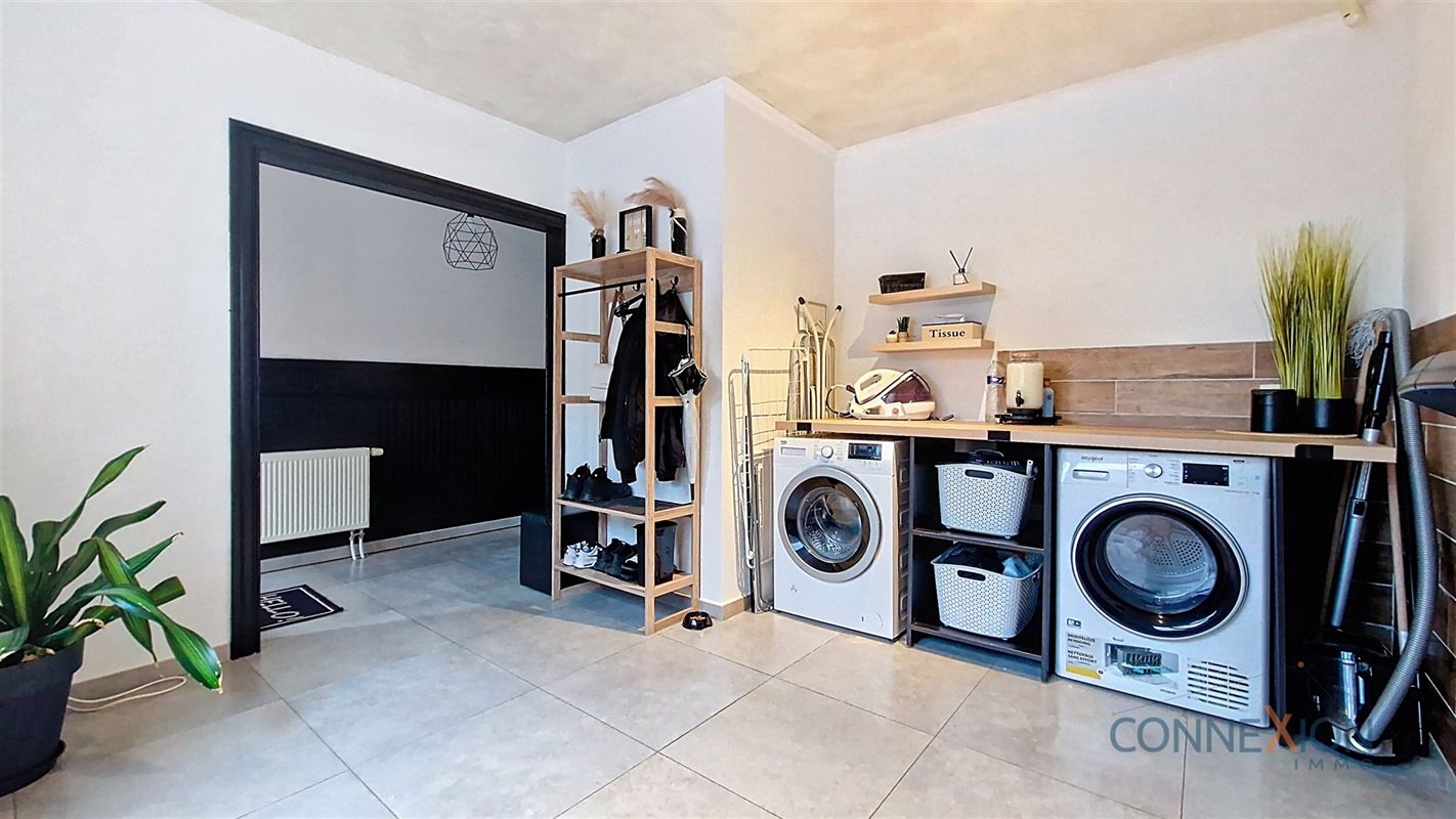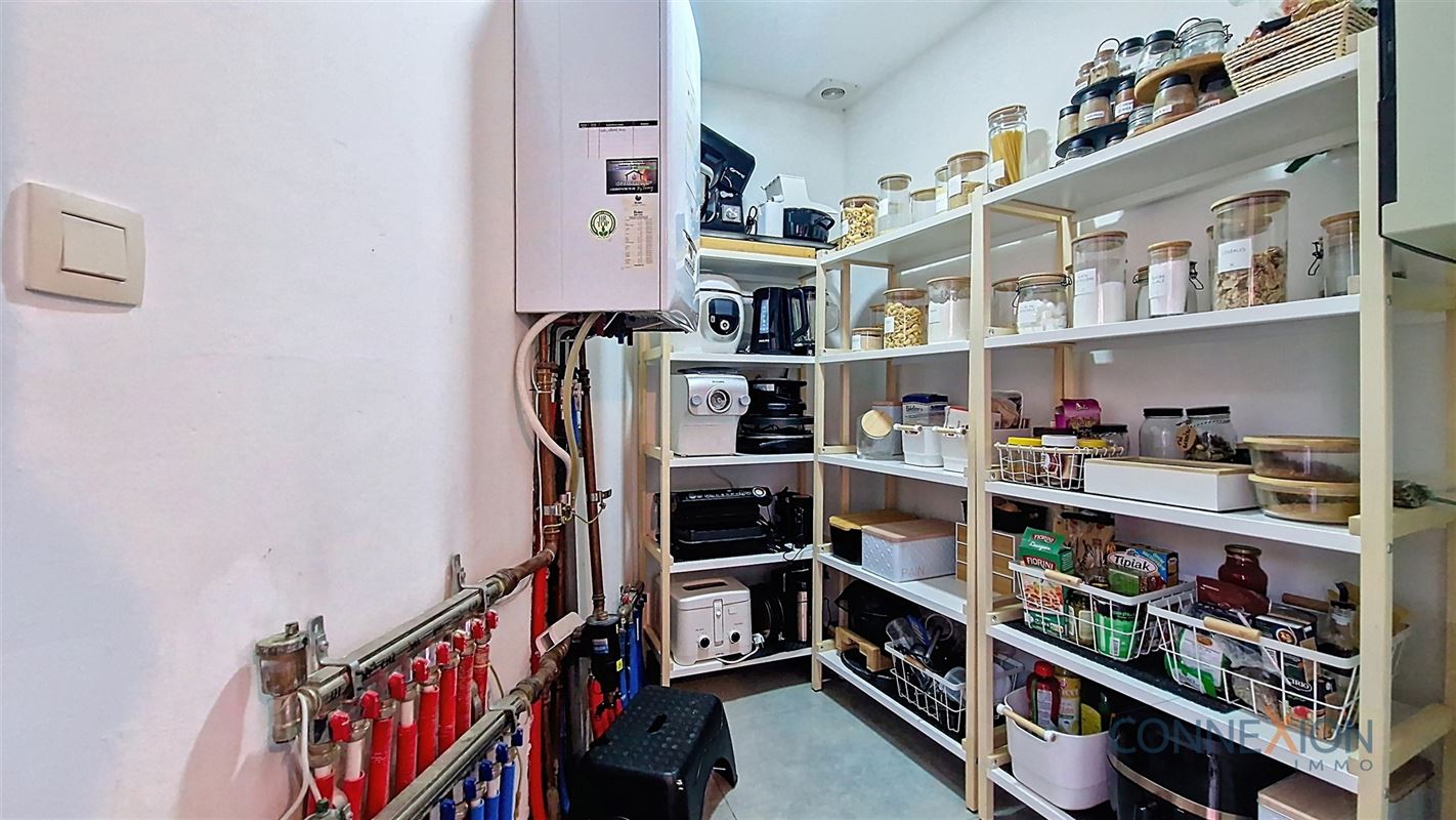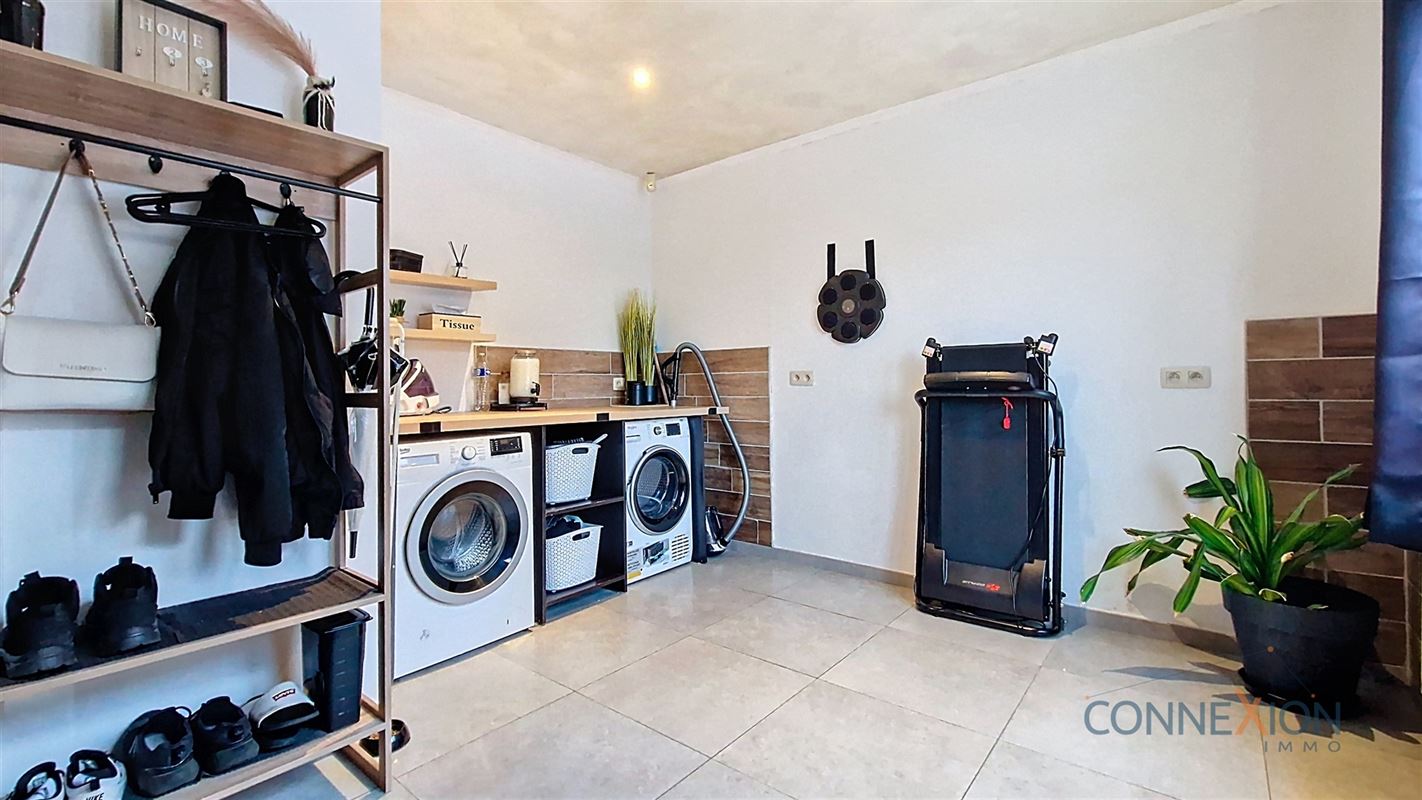 Comprend au rez de chaussée : hall d'entrée, pièce en façade (bureau ou chambre), wc invités, beau grand living avec sa cuisine équipée, cellier/chaufferie et salle de douches.