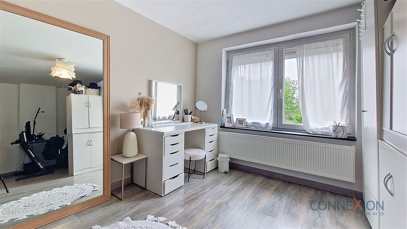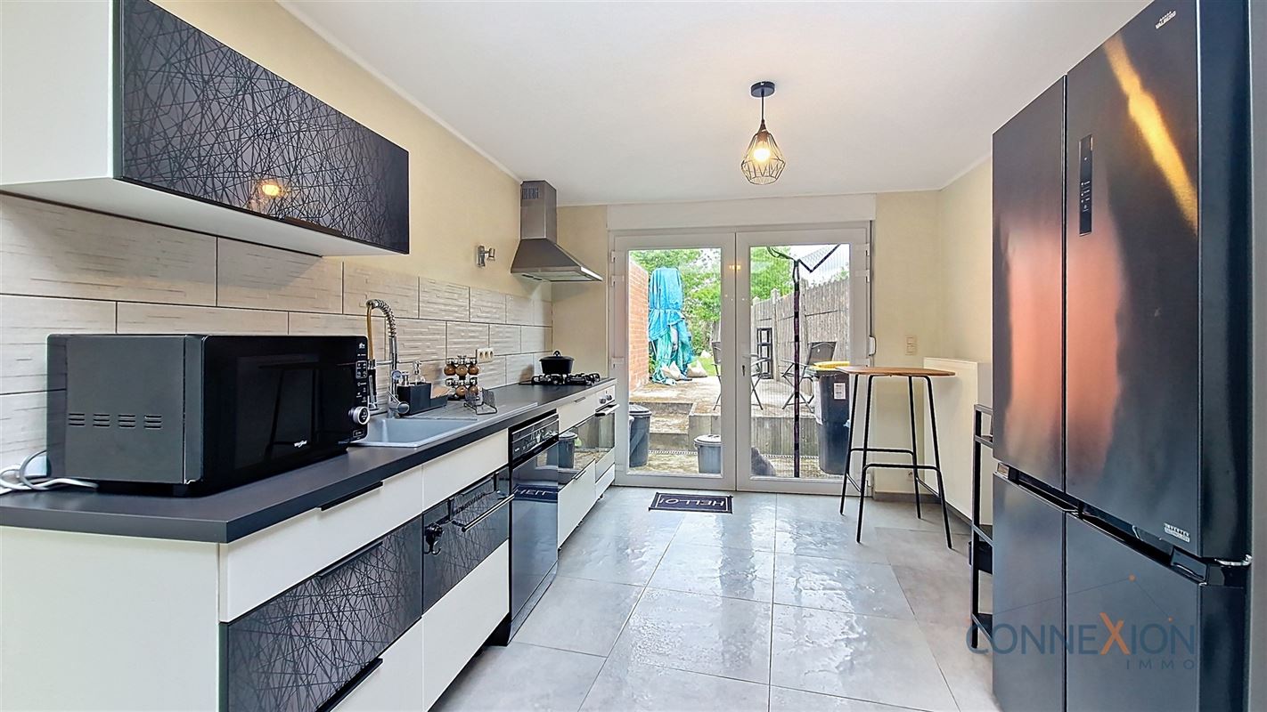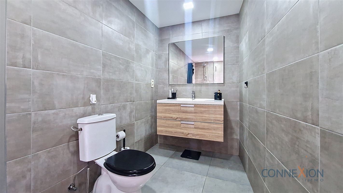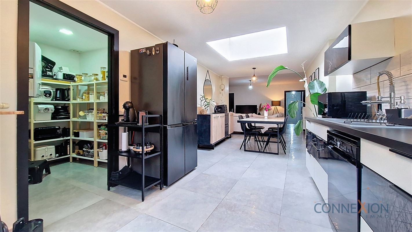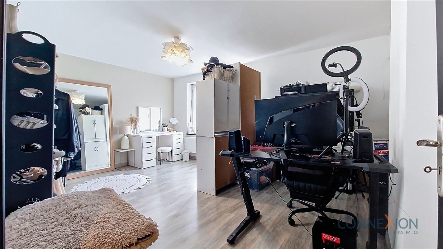 Comprend au rez de chaussée : hall d'entrée, pièce en façade (bureau ou chambre), wc invités, beau grand living avec sa cuisine équipée, cellier/chaufferie et salle de douches.
