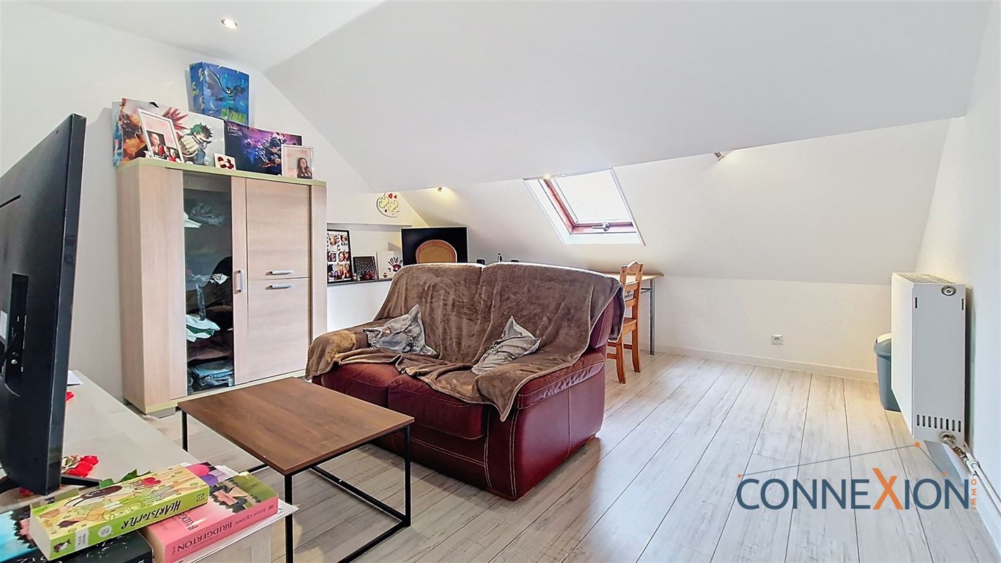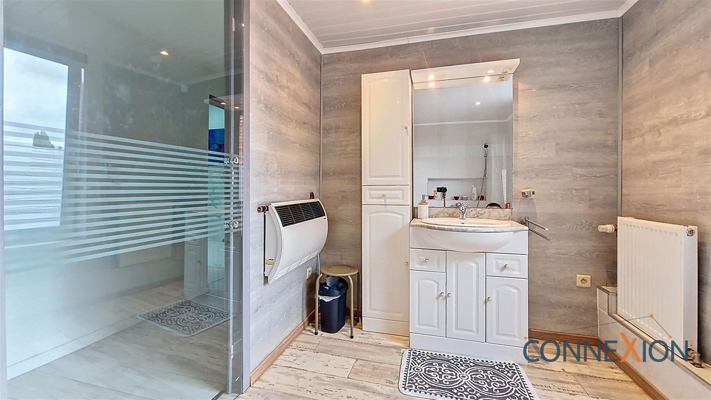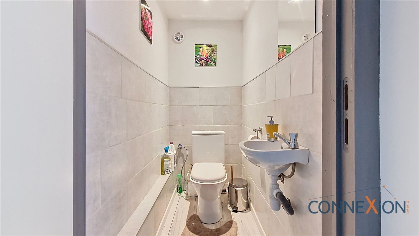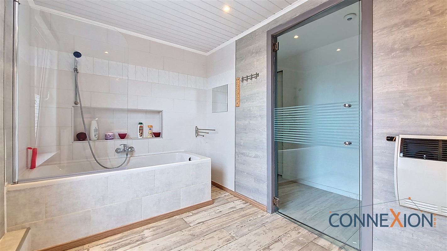 À l’étage, vous trouverez un wc séparé avec lave-mains, la salle de bains (avec meuble lavabo et baignoire) et 1 chambre.
