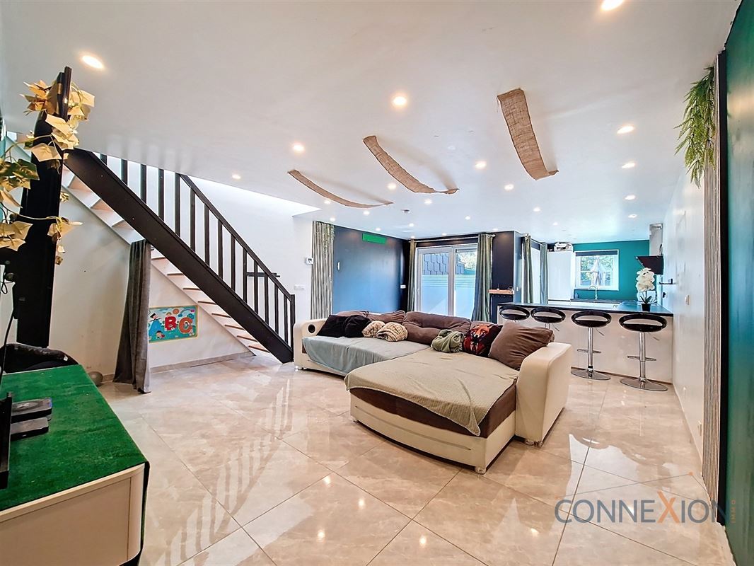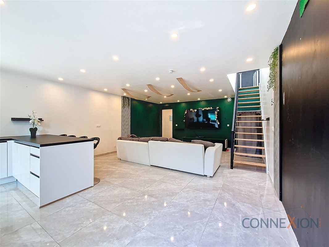 Au rez-de-chaussée : un hall d’entrée avec espace vestiaire, wc séparé, accès au garage avec buanderie, et un vaste living ouvert sur une cuisine full équipée.