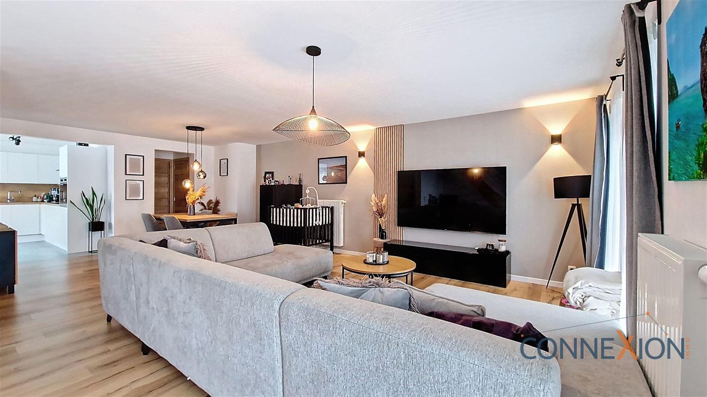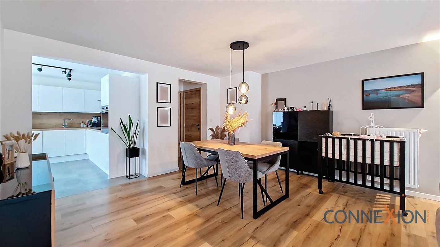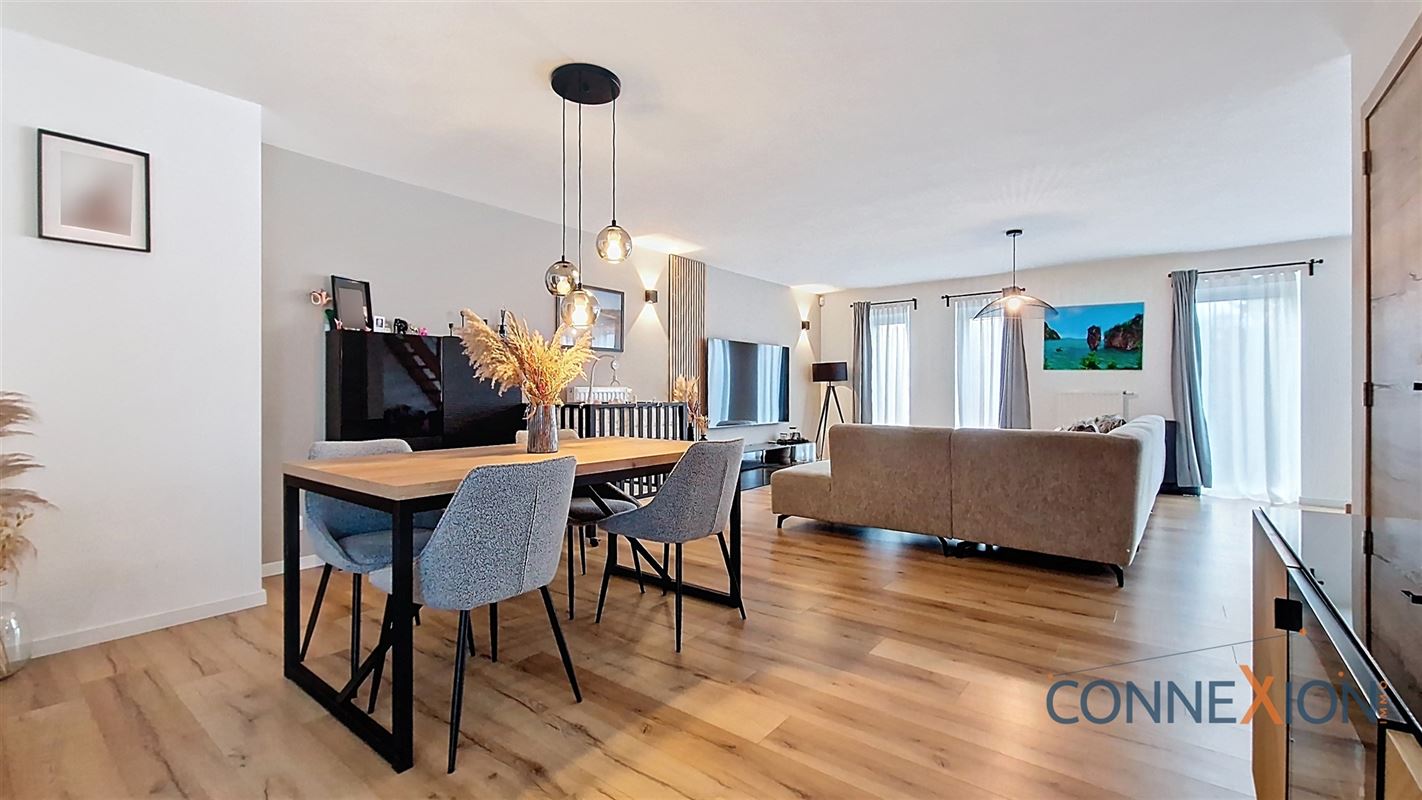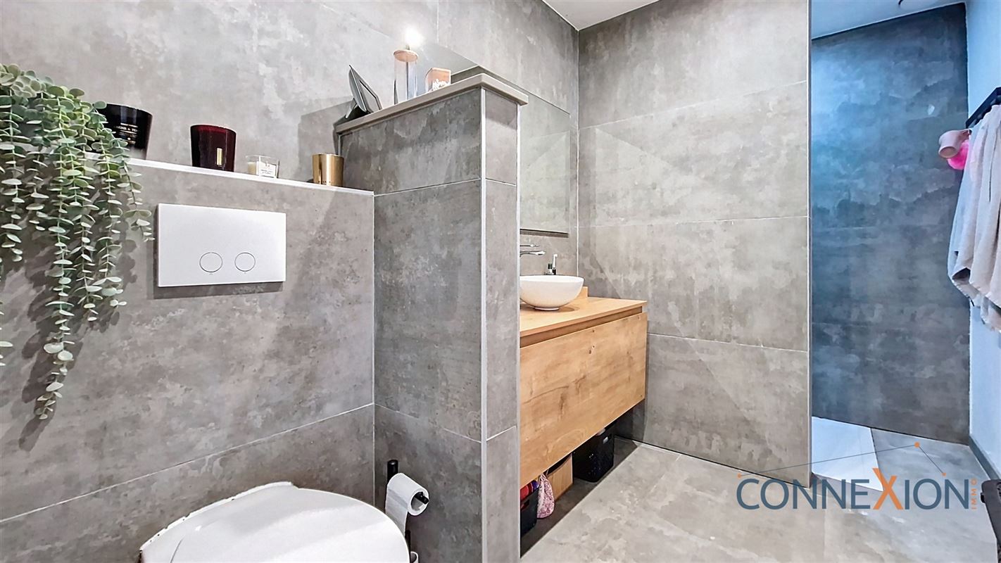 Au rez, hall d'accueil (avec vidéophone & porte automatique sécurisée). Au premier étage : hall d'entrée ouvrant vers un très beau living lumineux, cuisine équipée (avec balcon), wc invités et buanderie.