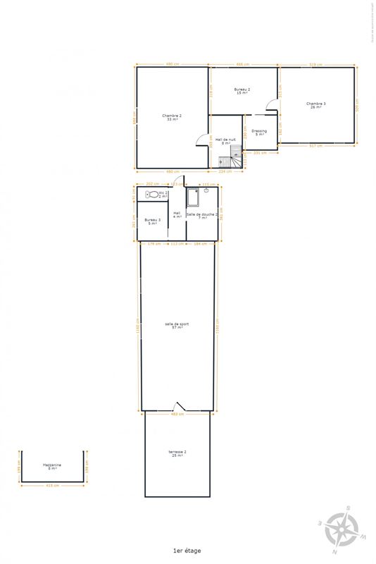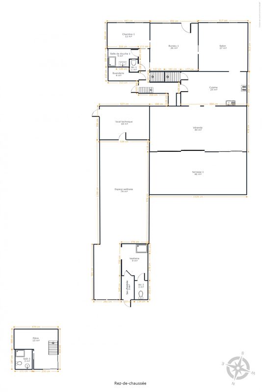 L’annexe est composée au rez-de-chaussée : espace wellness de 73 m² comprenant piscine intérieure chauffée, sauna, hammam, jacuzzi, salle de massage, douche, vestiaire, wc , espace technique.