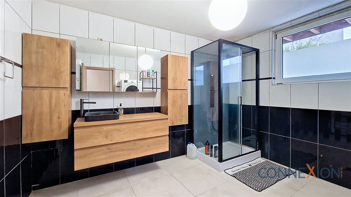 Au rez-de-chaussée : hall d’entrée, grand séjour de plus de 40m², cuisine équipée et salle de douches avec wc et espace buanderie.